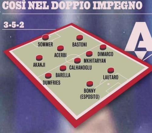 锋线上,劳塔罗包机提前一天回来,就是为了这场能够首发,而博尼上一场1球3助的数据,也让他在与皮奥的竞争中占据了优势。中场三人组是上赛季的首发配置,恰尔汗奥卢和巴雷拉的位置毫无疑问,姆希塔良则凭借国际比赛日期间休息积攒的体能更接近首发,当然用苏西奇也没问题,他只踢了一场国家队比赛,消耗也不算大。左右两翼是迪马尔科和邓弗里斯的组合,两人在国家队比赛期间都有助攻入账,正是脚风顺的时候,不过两人都是在国家队连续踢满两场,体能可能会存在问题!