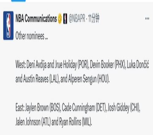 西部:阿夫迪亚和霍勒迪(开拓者)、布克(太阳)、东契奇和里夫斯(湖人)、申京(火箭)