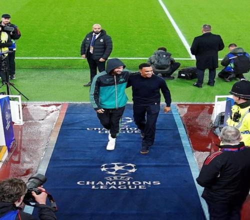 如今,阿诺德代表皇马重返安菲尔德,进入替补席,赛前,阿诺德和前队友索博斯洛伊重聚,两人肩并肩,面带微笑。