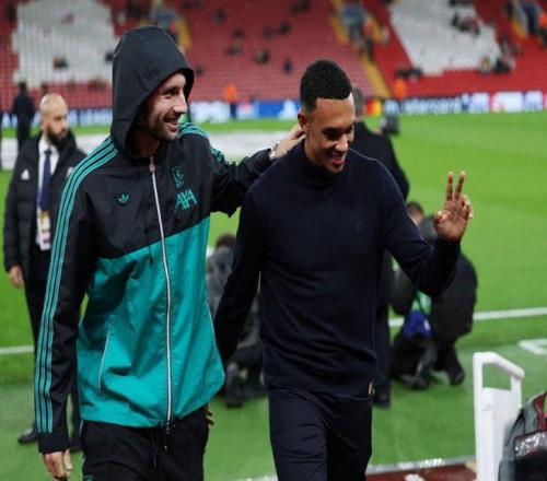 欧冠联赛阶段第四轮,利物浦主场对阵皇家马德里,重返安菲尔德的阿诺德替补待命,赛前他和前队友索博斯洛伊肩并肩走入球员通道。