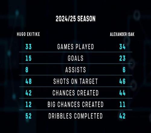唯一的区别是,我们这个赛季要踢60场,而他们上赛季各自踢了33和34场联赛。除此之外确实很相似。不过我认为他们虽然有相同的特质,但也有不同的特点。埃基蒂克可以踢左路,而伊萨克更像纯粹的九号。伊萨克是那种终结型中锋,而埃基蒂克更喜欢拉到左侧接应。