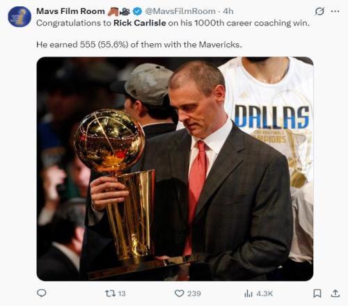 卡莱尔这千胜,独行侠就贡献了555胜,步行者345胜,活塞100胜,诺维斯基、东契奇等人都为卡帅发来了祝贺。