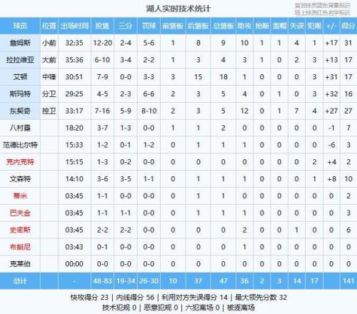 詹姆斯31分9板10助、东契奇27分5板12助、艾顿17分18板1助、拉拉维亚17分4板3助、斯玛特16分5板4助、文森特10分1板1助、八村塁7分2板、史密斯6分2助