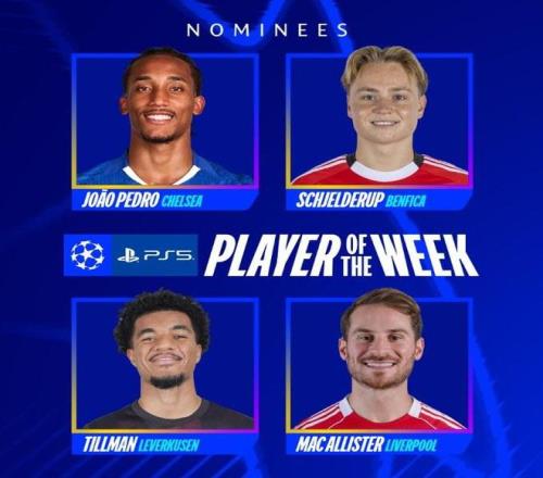 欧冠联赛阶段第8轮比赛全部战罢,欧冠官方公布了本周最佳球员候选名单,分别是若昂-佩德罗、麦卡利斯特、谢尔德鲁普和马里克-蒂尔曼。