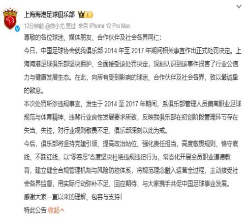 周四,中国足协正式公布受处罚俱乐部名单,上海申花、上海海港两家俱乐部公开道歉。